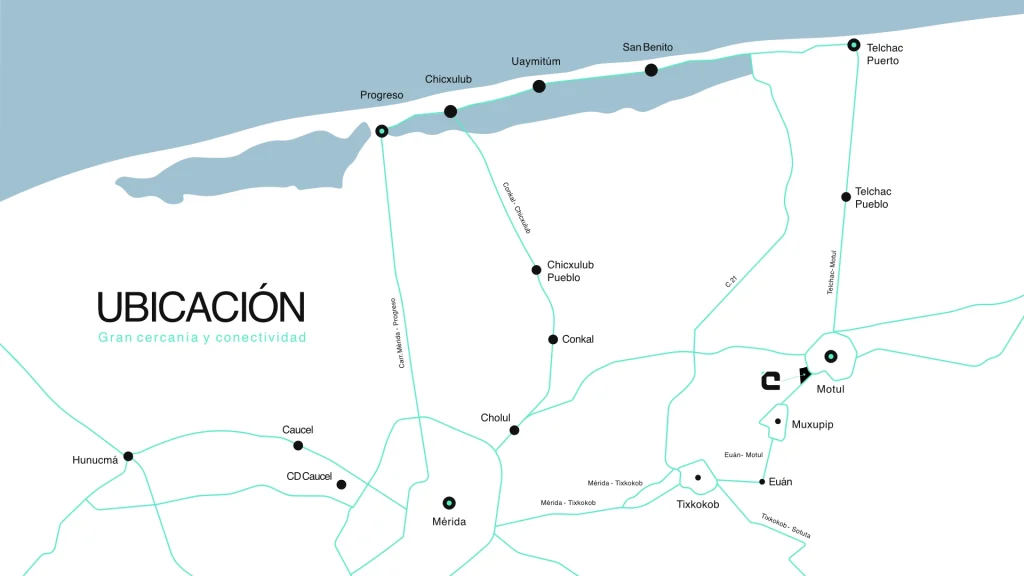 - Ubicación estratégica: A 20 minutos del norte de Mérida, a 20 minutos de la playa de Telchac (zona hotelera) y conectividad con carreteras federales